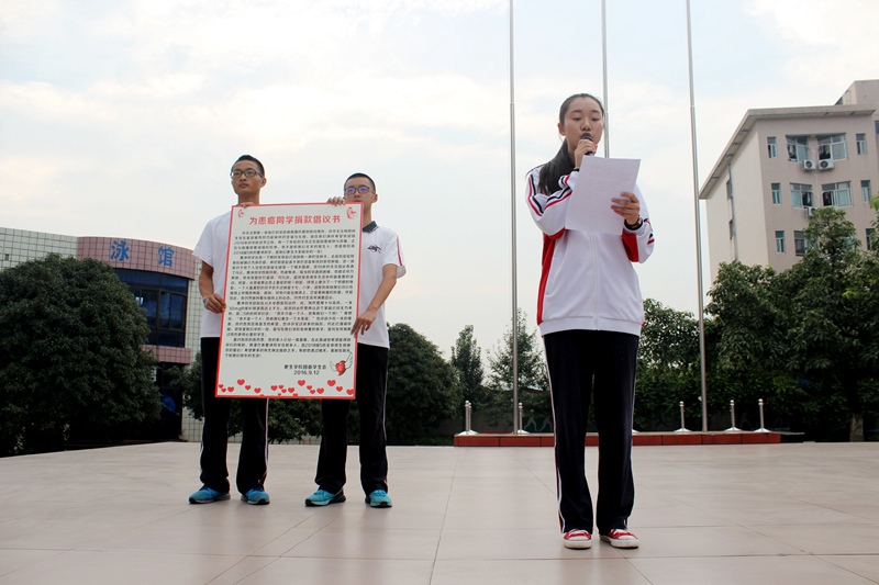 2016年9月12日,周一朝會(huì),更生學(xué)校團(tuán)委、學(xué)生會(huì)向全校師生發(fā)出倡議,為我校高2018屆5班學(xué)生罹患淋巴癌的曹凈同學(xué)進(jìn)行愛心捐款。短短一天時(shí)間共募集愛心捐款43940元。9月13日下午,學(xué)校領(lǐng)導(dǎo),高二年級(jí)師生代表來(lái)到曹凈同學(xué)家中,將這份代表更生這個(gè)大家庭的愛心交到了曹凈同學(xué)的父母手中。