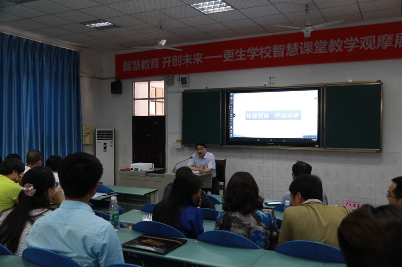 交流課后阮平校長(zhǎng)發(fā)言,他說(shuō)互聯(lián)網(wǎng)快速發(fā)展,科技改變?nèi)祟惿?,我們必須跟上信息化社?huì)的步伐,利用互聯(lián)網(wǎng)+教育讓教學(xué)質(zhì)量更上臺(tái)階。接下來(lái)教導(dǎo)處王德輝老師就更生學(xué)校智慧課堂開(kāi)展的情況及有關(guān)技術(shù)方面向來(lái)賓進(jìn)行了介紹。