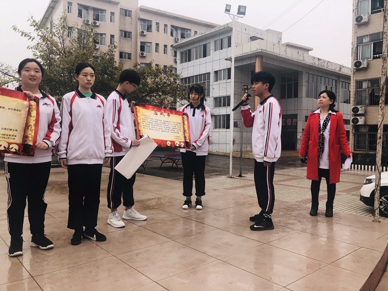 4月12日,天有微雨,但同學(xué)們的熱情卻絲毫未減。下午5點,9個班級的學(xué)子齊聚集會廣場,胡雨佳和周柯斌兩位主持人宣布儀式正式開始。高一7班學(xué)生代表宋慧敏同學(xué)作為學(xué)生代表發(fā)言,介紹了自己在學(xué)習(xí)上的經(jīng)驗和所得。年級主任丁莉萍作為教師代表講話,她首先表揚了同學(xué)們在上期末統(tǒng)考和本次月考中取得的優(yōu)異成績,希望同學(xué)們保持拼搏奮進的勢頭,力爭做得更好。另外,她也講到了此次挑應(yīng)戰(zhàn)的積極意義所在,并對同學(xué)們提出殷切期盼,對同學(xué)們的在校的學(xué)習(xí)生活及年級管理提出了具體要求。