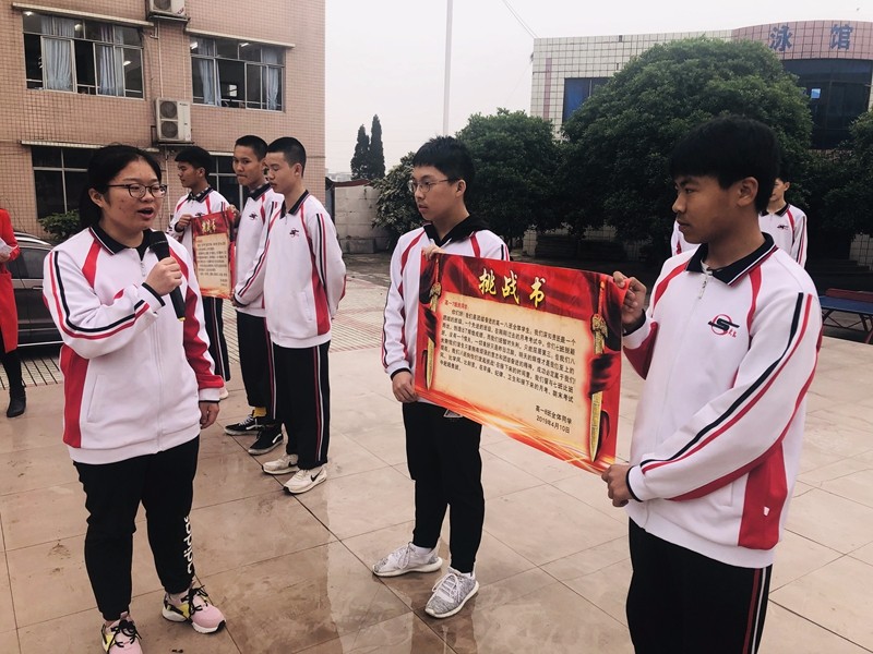 挑應(yīng)戰(zhàn)正式開始,文理科班班長分兩批次上臺,分別向自己挑戰(zhàn)或應(yīng)戰(zhàn)的班級宣讀了挑戰(zhàn)書或應(yīng)戰(zhàn)書?!罢l英雄,誰好漢,每次考試比比看!”“文者稱雄,武者稱霸;唯我五班,雄霸天下!”……各班戰(zhàn)書或鋪成排比,或古文寫就,氣勢磅礴,文采斐然。同學(xué)們更是士氣高昂,信心百倍,不甘示弱。