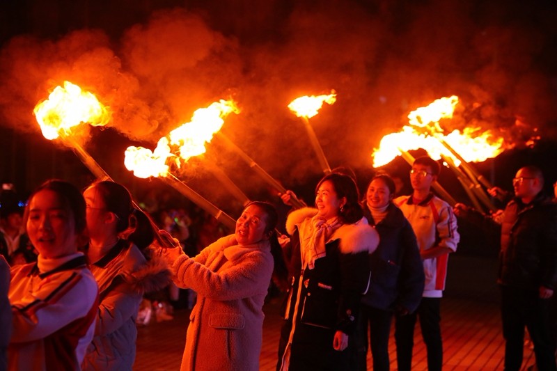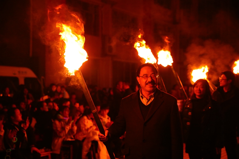 在阮頓副校長宣布篝火晚會開始后,由阮平校長領(lǐng)隊,20位來自不同部門、不同年級的師生點火代表手持火把在全場的歡呼聲中繞場一圈后點燃了四堆篝火。
