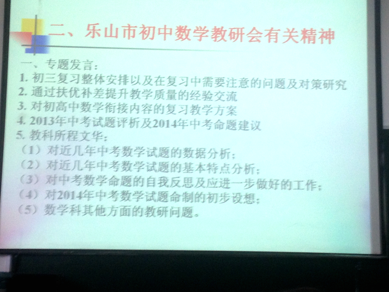我校初三教師將結(jié)合本校學(xué)生的實際情況,取長補短,做好“培優(yōu)補差”工作,有條不紊地展開一輪復(fù)習(xí),以昂揚樂觀的心態(tài)備戰(zhàn)2014年的樂山中考一調(diào)。