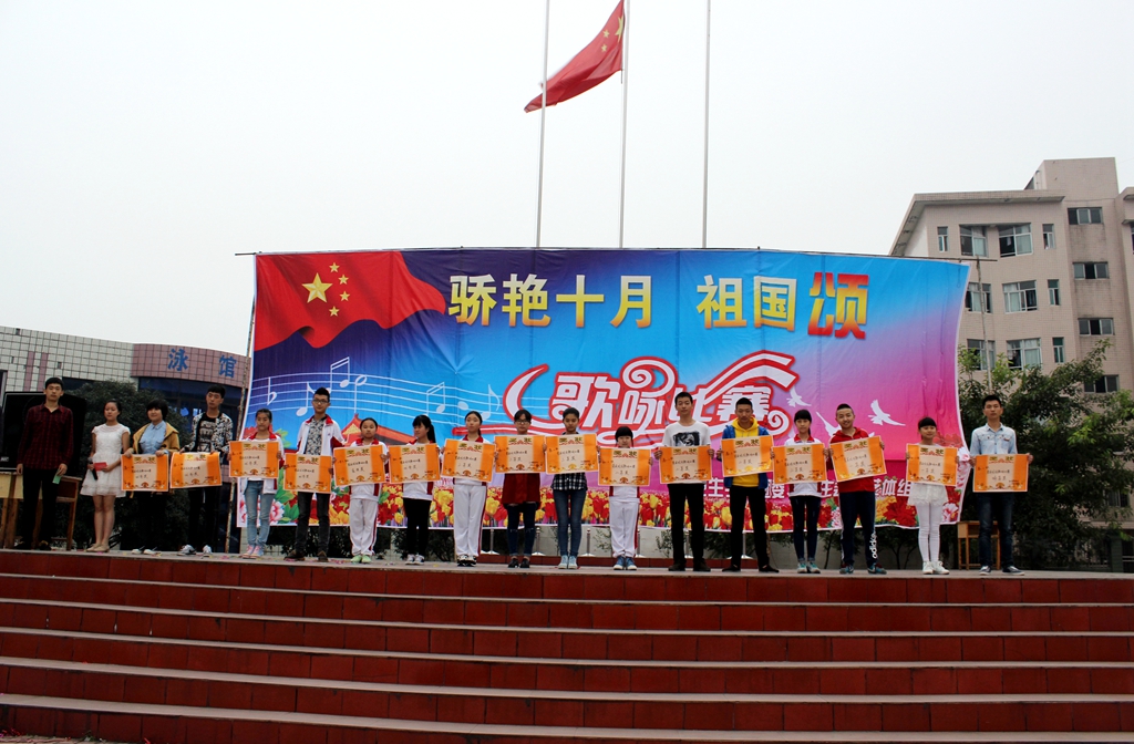 六十五華誕,舉國歡慶。2014年10月10日,我校在國旗廣場上隆重舉行“嬌艷十月祖國頌”歌詠比賽,在熱烈的比賽中,各班同學(xué)活力四射,精彩節(jié)目連連,高潮迭起,整個(gè)會場都沸騰起來。最終,特等獎被高二、2班摘得,其余獎項(xiàng)如下,一等獎(高二、10班;初一、2),二等獎(初三、2班;高一、8班;高一、9班),三等獎(高二、9班;高二、12班;初二、2班;高一、10班),小學(xué)五、六年級獲得表演獎。