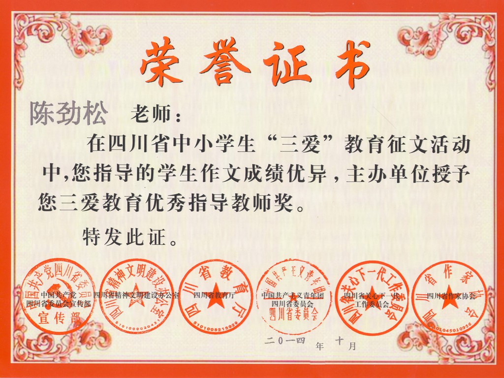 在今年上半年舉行的四川省中小學生“三愛”教育征文活動中我校積極組織學生參加比賽,在上半年的征文初選活動中我校選送了150余篇文章參加評選,有10位同學獲一等獎,19位同學獲二等獎,29位同學獲三等獎。在10月舉行的復選中我校有3位同學參加了現(xiàn)場考試,其中高中組蔡麗敏同學以第一名的成績獲唯一一個一等獎。我校組織得力,成績優(yōu)異,近日被四川省中小學生“三愛”教育征文活動主辦方授予“優(yōu)秀組織集體獎”,蔡麗敏同學的指導教師陳勁松老師獲得優(yōu)秀指導教師獎。(文/王佳秀)