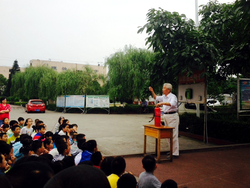 隨后,王主任強(qiáng)調(diào)使用滅火器時(shí)要保持鎮(zhèn)靜,在距離火源2米處對(duì)準(zhǔn)火苗根部進(jìn)行噴射,并進(jìn)行了現(xiàn)場(chǎng)演示。孩子們近距離地觀看滅火器的使用,感到非常新奇有趣。最后,他還給孩子們講述了高中學(xué)生面對(duì)突發(fā)事件,恰當(dāng)運(yùn)用學(xué)到的消防知識(shí)正確滅火,避免火災(zāi)的故事。